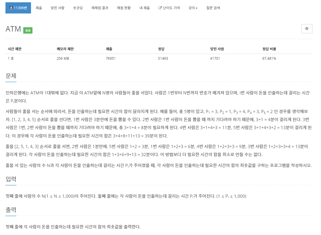 문제를 읽어보면 OS 스케쥴링에서 SJF 알고리즘인것을 확인할 수 있다. 기존 1번 방식으로 모든 사람이 돈을 인출하는데 걸리는 wating time은 FIFO 스케쥴링에 의해 39 분을 기다려야 한다. 반면 SJF 는 가중치(P)가 가장 작은 순서 우선으로 처리한다.