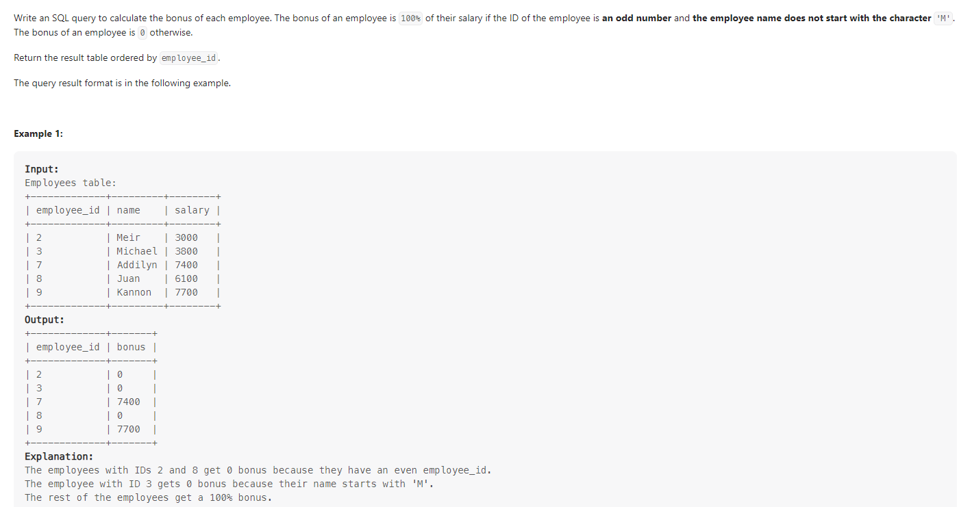 Employees 테이블에서 employee_id 가 짝수이거나 name이 M으로 시작하는 직원은 0의 bonus를 받고 그 외 직원은 salary의 100%를 보너스를 받도록 SQL을 작성하는 문제이다. (단 employee_id를 기준으로 정렬해야한다)