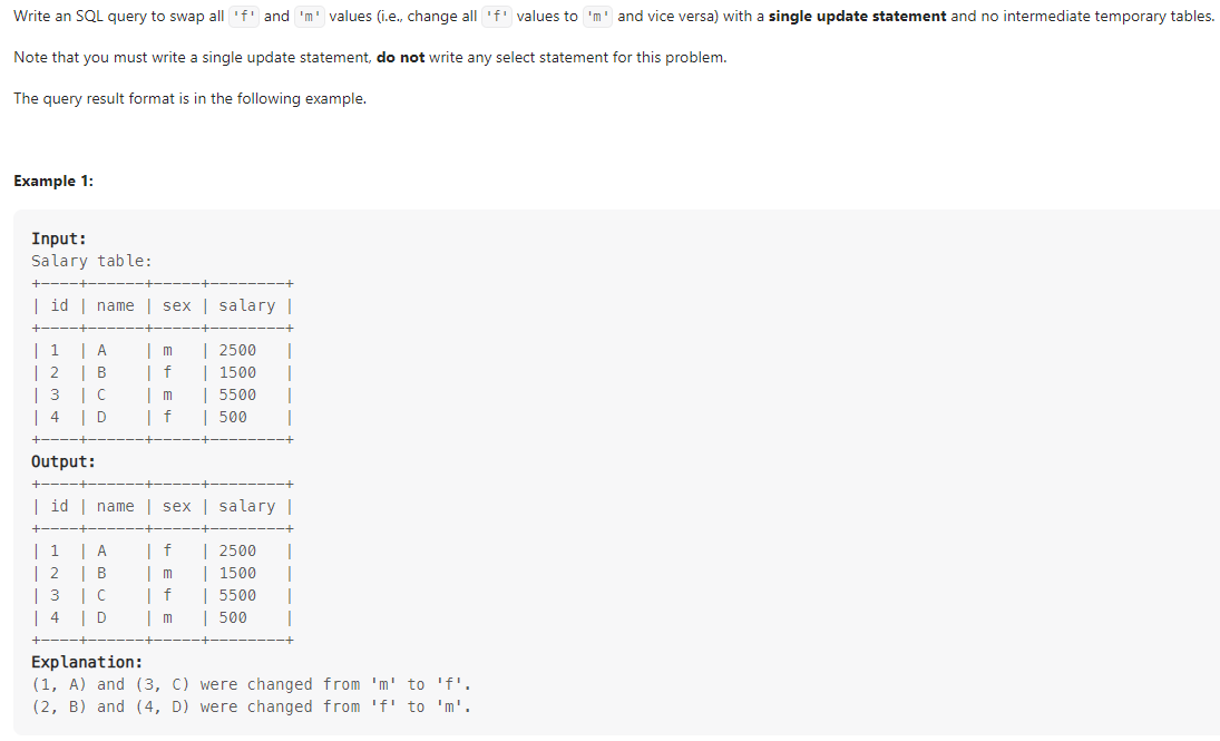 update Salary set sex = if(sex='m','f',if(sex='f','m',sex))