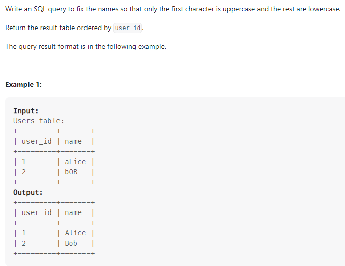 Users 테이블에 name 필드에서 name의 첫번째 문자는 대문자, 이후 문자는 소문자로 변환하여 반환하는 SQL을 작성하는 문제이다. (핵심은 SQL의 문자열 함수를 사용해 적절히 변환 하는것이다.)