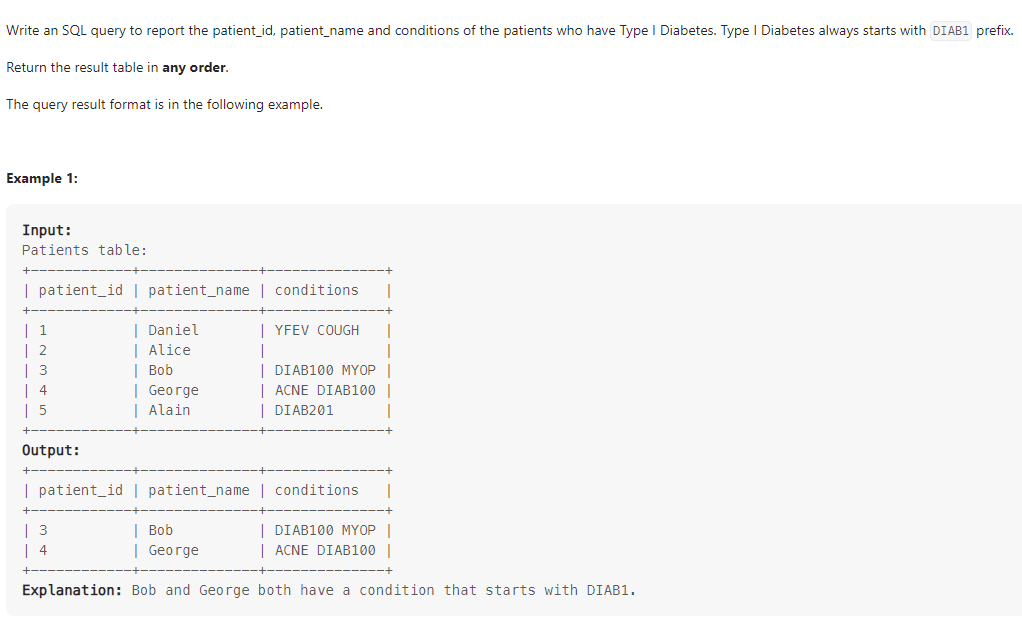 Patients 테이블에서 conditions 가 'DIAB1'로 시작하는 모든 레코드를 반환하도록 SQL을 작성하는 문제이다.