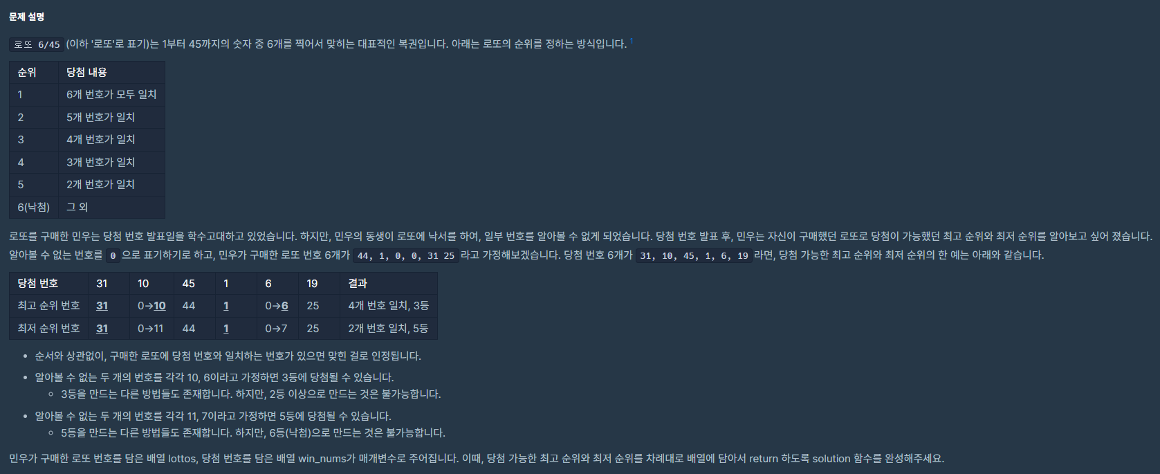 2021 Dev-Matching 상반기 1번 문제로 지워진 로또 번호를 가지고 최대 등수와 최소 등수를 구하는 문제이다.