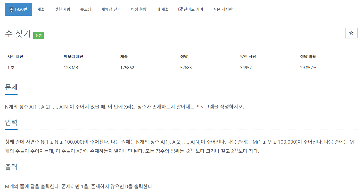 N개의 수 중에서 M 개의 수가 존재하는지 여부를 0,1로 출력하는 문제이다. 총 M 개의 수가 N에 존재 하는지 알기 위해서 브루트포스 알고리즘을 사용한다면 N*M 즉 10000000000으로 시간초과가 발생한다. 때문에 이분탐색으로 logN 의 시간복잡도를 활용하여 문제를 풀어야 한다.