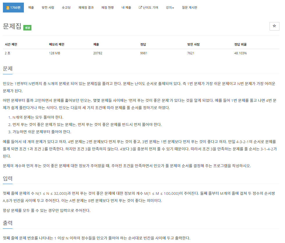 DFS로 풀수 없다는 것을 알게된 후 결국 솔루션을 찾아 보았다. 위상정렬로 한번에 해결 할 수 있었다. 자료구조 그래프 이론 공부가 충분하지 않아 위상 정렬에 대해 찾아보았다.