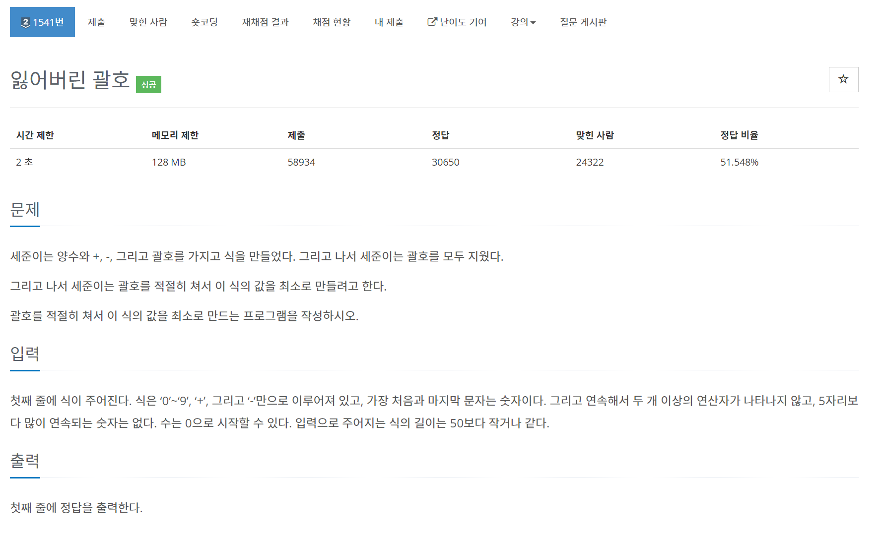 나는 조금 고전적이지만 스택을 사용하여 숫자와 - 기호를 쌓았다. 이후 하나씩 빼면서 - 를 만나기 전까지 결과를 모두 더하고 - 를 만나면 더한 값을 -1곱하여 누적 시켜주었다.