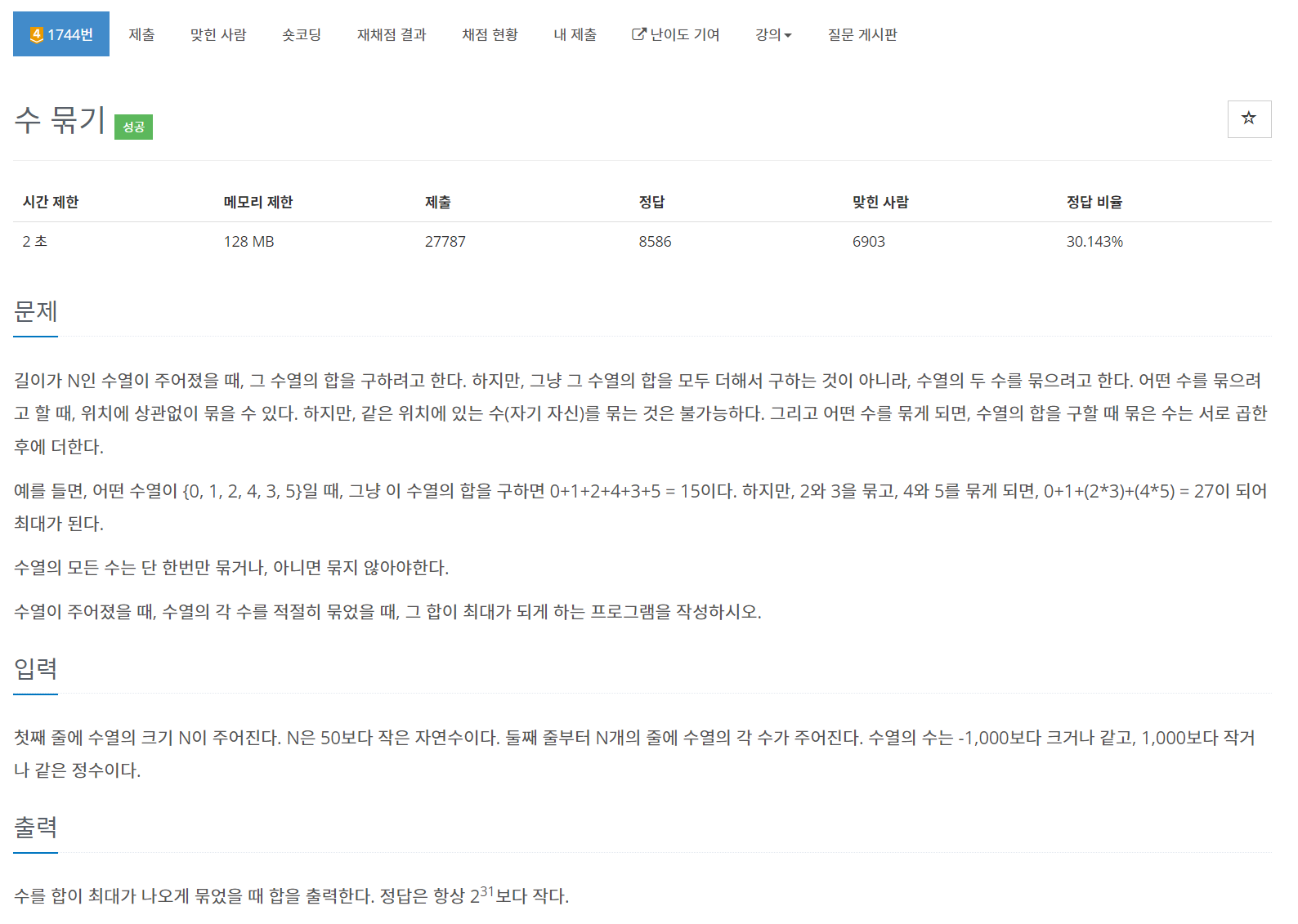 두 수를 묶거나 더하여 합이 최대가 되게 하는 문제이다. 상식적으로 오름 차순으로 정렬하여 앞에서부터 두개씩 묶으면 될것 같은 생각이 들지만 문제에서 음수와 0이 존재하기 때문에 다른 방법을 선택하야한다.