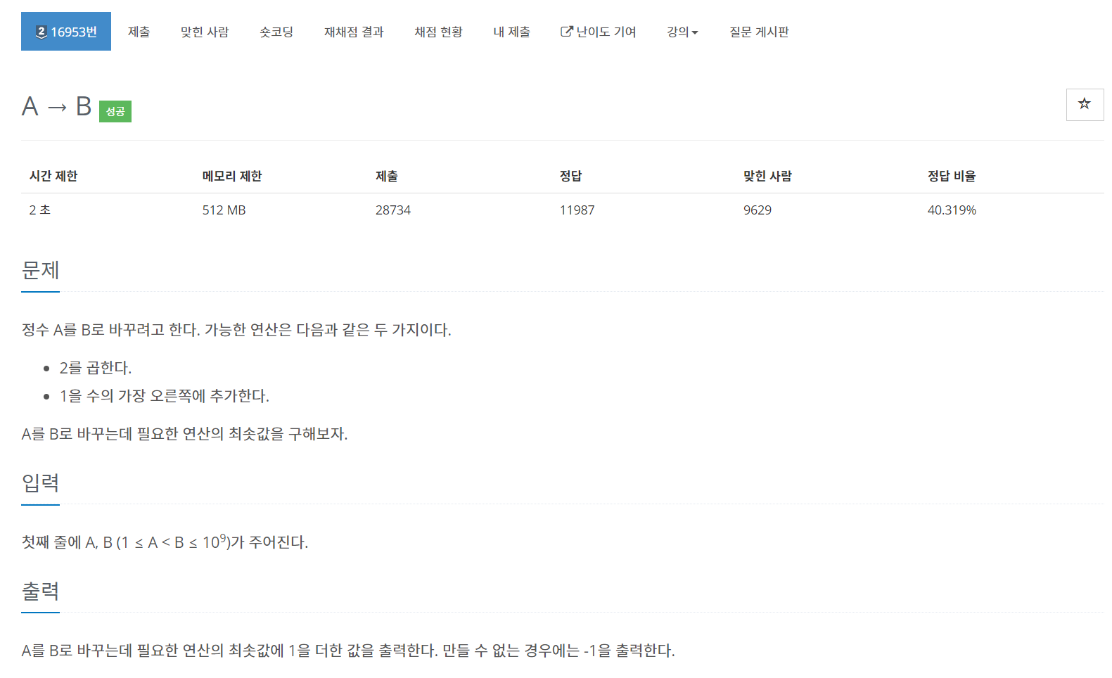 또 다른 풀이는 A를 기준으로 조건(A*2 또는 A의 가장 오른쪽에 1을 추가)을 적용하여 A==B일때 까지 찾아가고 A > B 일 경우 만들수 없음을 표시해준다.