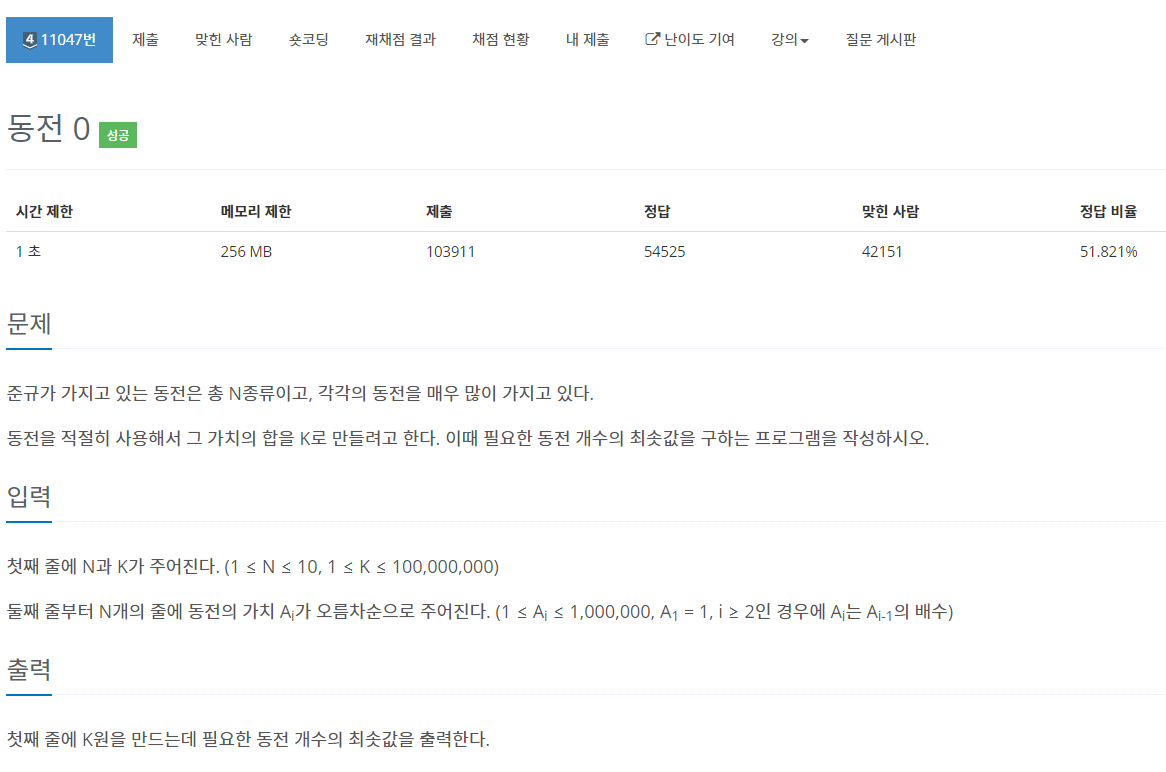 풀이방법은 N개의 동전을 가치가 가장 큰 순서대로 정렬을 한다. 그리디는 말 그대로 선택의 순간마다 당장 눈앞에 보이는 최적의 상황만을 쫓아 최종적인 해답에 도달하는 방법이다. 따라서 동전 개수를 최소한으로 하기 위해 선택의 순간마다 가치의 합 K를 결정할때 K보다 작은 동전중 가장 큰 가치를 가진 동전을 선택하면 된다.