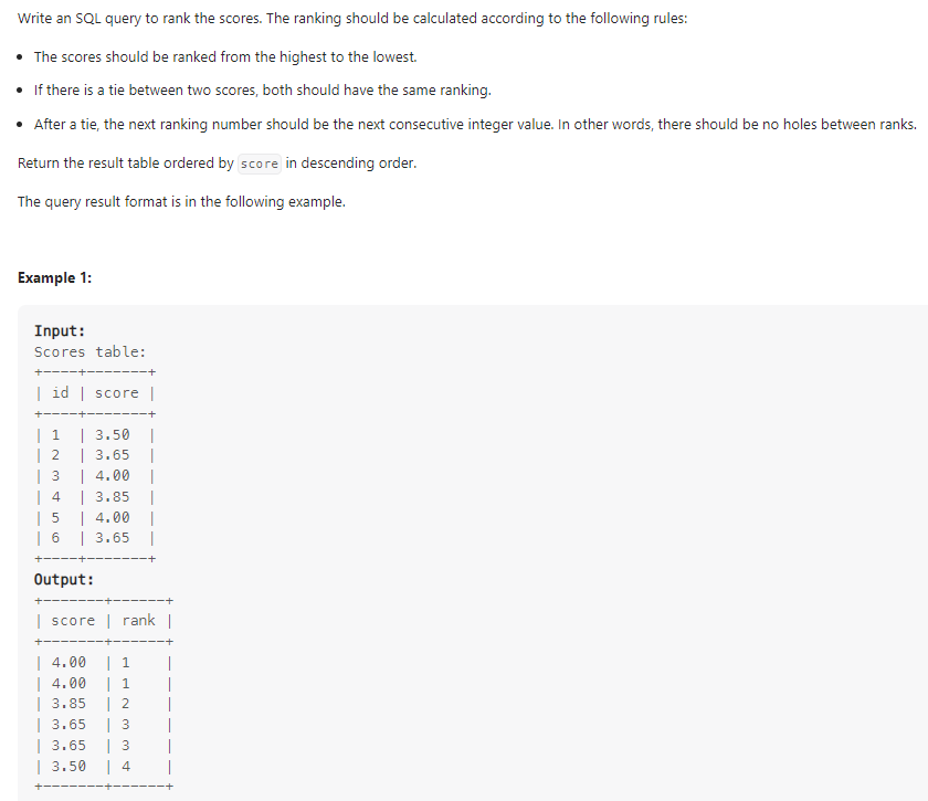 SELECT score, DENSE_RANK() OVER(ORDER BY score DESC) "rank"