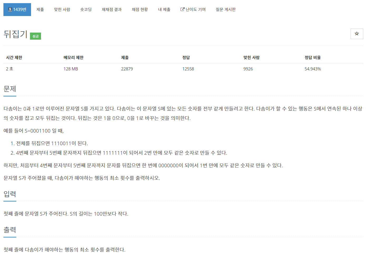 이 문제는 0을 뒤집거나 1을 뒤집어서 최소한의 뒤집기로 같은 숫자를 만드는 문제이다. 따라서 0과 1이 바뀌는 구간을 기준으로 0인 구간의 갯수과 1인 구간의 갯수중 최소인 숫자를 뒤집으면 답이된다.