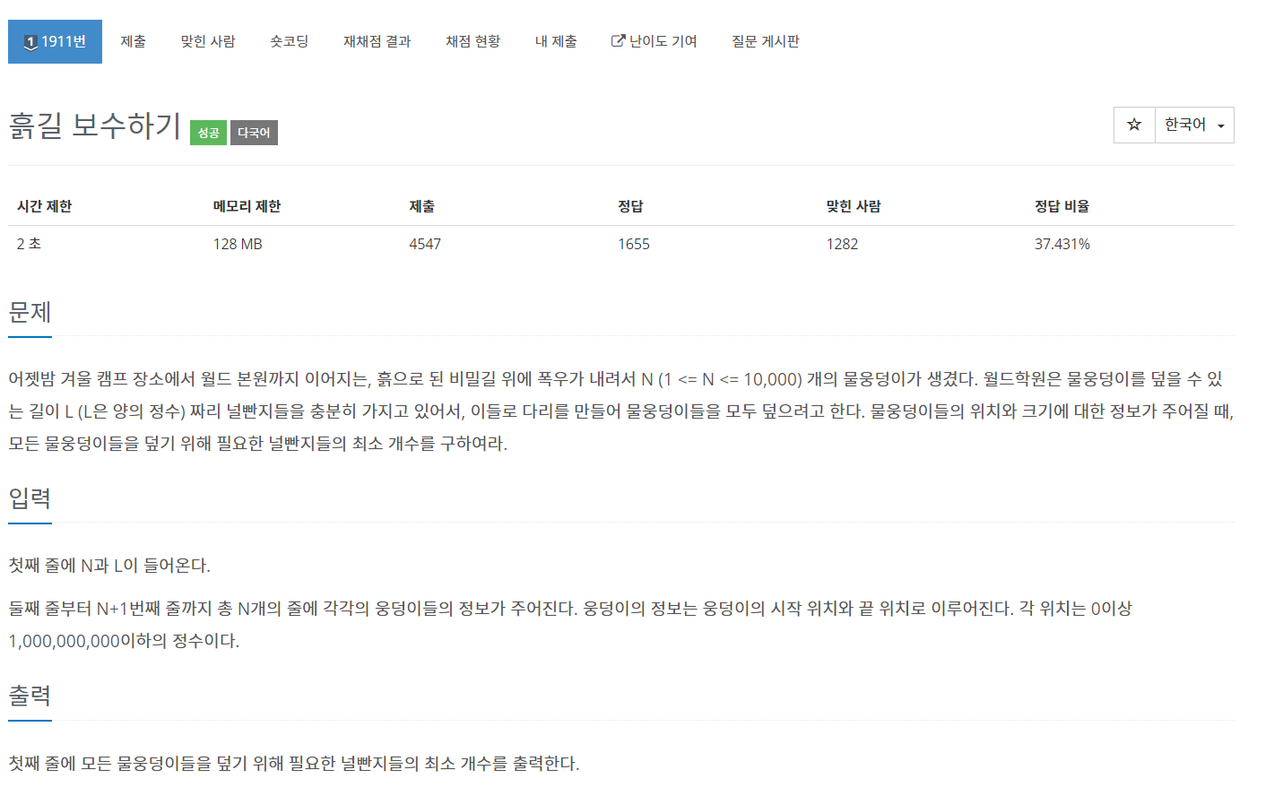 문제의 힌트를 보면 잘 이해가 되지 않는다. 상식적으로 웅덩이를 덮을때 시작점에 딱 맞춰서 널빤지를 붙이면 최적이다.