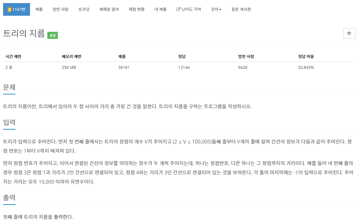 기본적인 방식은 특정 아무 위치에서 DFS를 통해 길이가 최대가 되는 시작점을 구하고, 그 시작점에서 다시한번 DFS를 돌리면 된다.