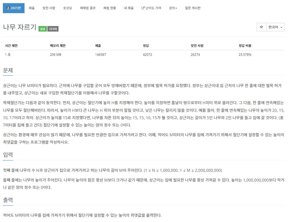 핵심은 적절한 나무 길이를 구하기 위해 이진 탐색을 이용해야하는 것이다.