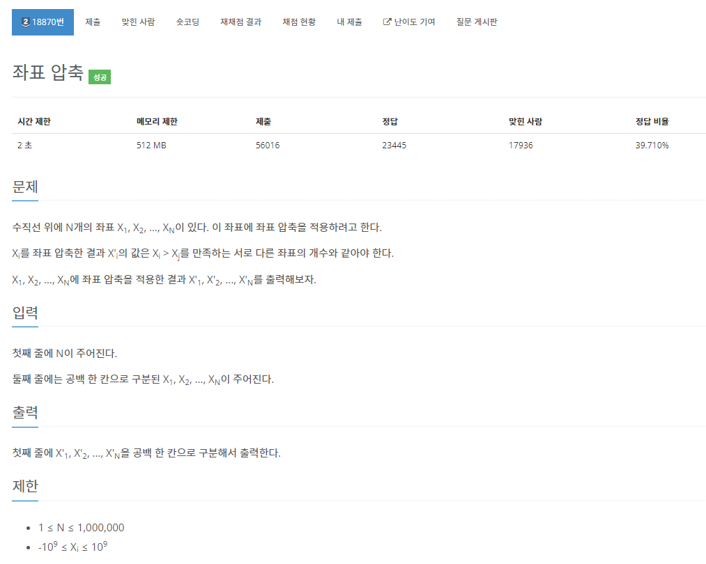 입력을 보았을때 가장 작은 숫자는 항상 0으로 압축이된다. 이를 바탕으로 좌표를 오름차순으로 정렬하고 i=1, i번째 좌표가 i-1번째 좌표보다 클 경우 이전 좌표값에서 1을 증가시켜주는 방법으로 갯수를 파악할 수 있다.