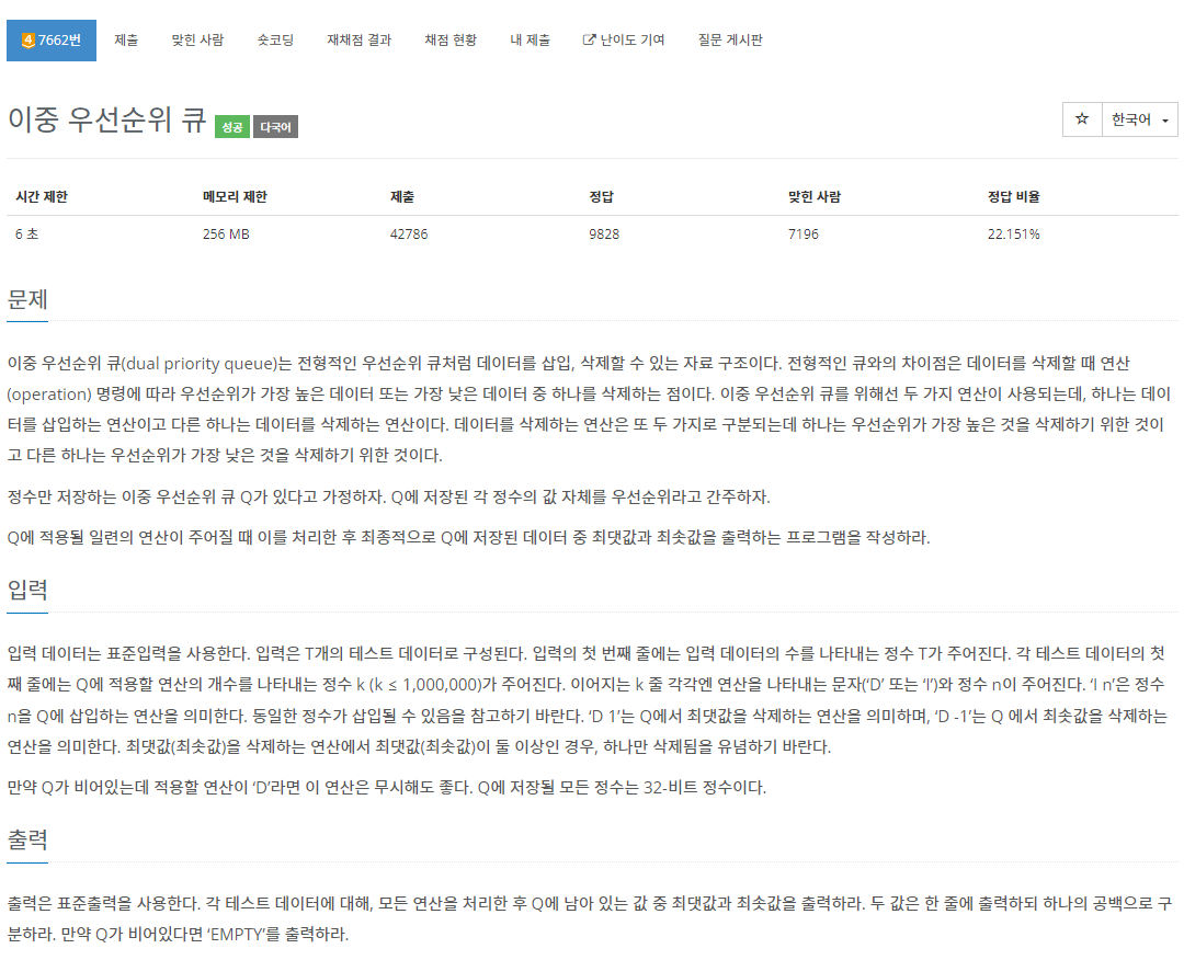 문제에서 Q의 종류중 D 1 은 가장 큰 값 삭제, D -1은 가장 작은 값 삭제를 수행하야 하지만 우선순위 큐 한개로는 불가능 하다. 따라서 MaxHeap, MinHeap으로 구현된 우선순위 큐 2개를 사용해야 한다.