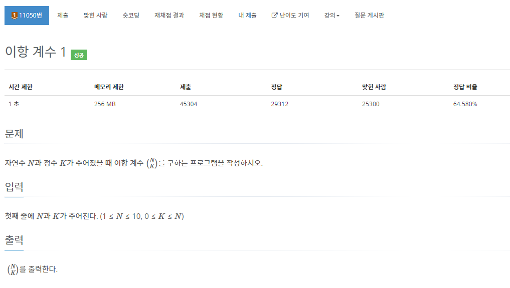 이항 계수는 n개의 서로 다른 물건 중에서 순서 없이 k개를 뽑는 조합의 가짓수 이고 이는 다음과 같이 정의 된다.