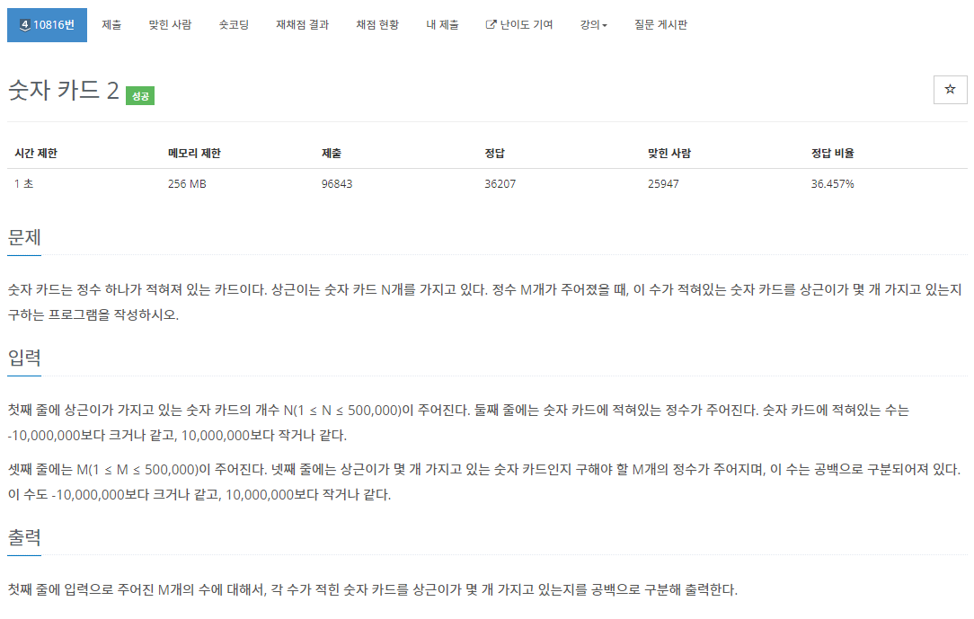 이 문제는 상근이가 가지고 있는 숫자 카드 N개 중 주어진 M(정수)를 몇개씩 가지고 있는지 구한는 문제이다. N은 -10,000,000 ~ 100,000,000 사이의 숫자로 중복된 값이 들어올 수 있다. 이를 해결하기 위해 N개의 카드 중 특정 숫자가 몇개 존재하는지 체크를 해야한다.