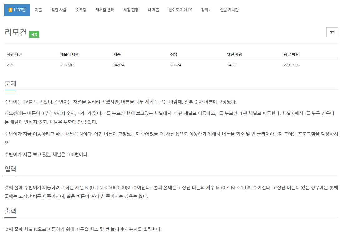 대충 시간복잡도를 계산해보면 리모컨 숫자 10개, 범위 1000000가 되고 부르트포스로 문제를 풀었을때 O(10000000) 이정도면 1억이 안되니 시간안에 풀수 있을것 같다고 생각했다.