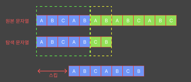 위의 그림을 살펴보면 초록색 점선과 노란색 점선이 있고 이는 각각 문자열이 일치하는 부분과 일치하지 않은 부분입니다. 이제 가장 중요한 스킵하는 부분을 설명하겠습니다.