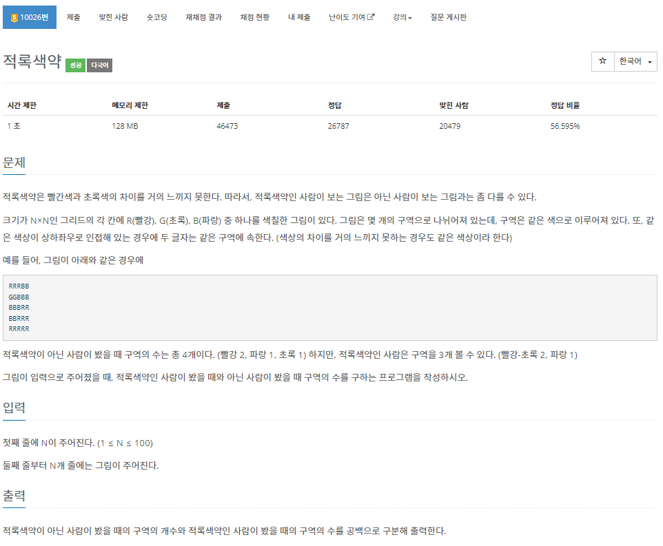 이 문제는 기본적인 DFS를 활용한 땅 갯수 구하기와 비슷한 문제이다. 문제에서 정상인이 보이는 색과 적록색약이 보이는 색이 다르다. 따라서 각각 정상인 경우와 적록색약인 경우로 나누어 각각 DFS를 돌리면 된다.