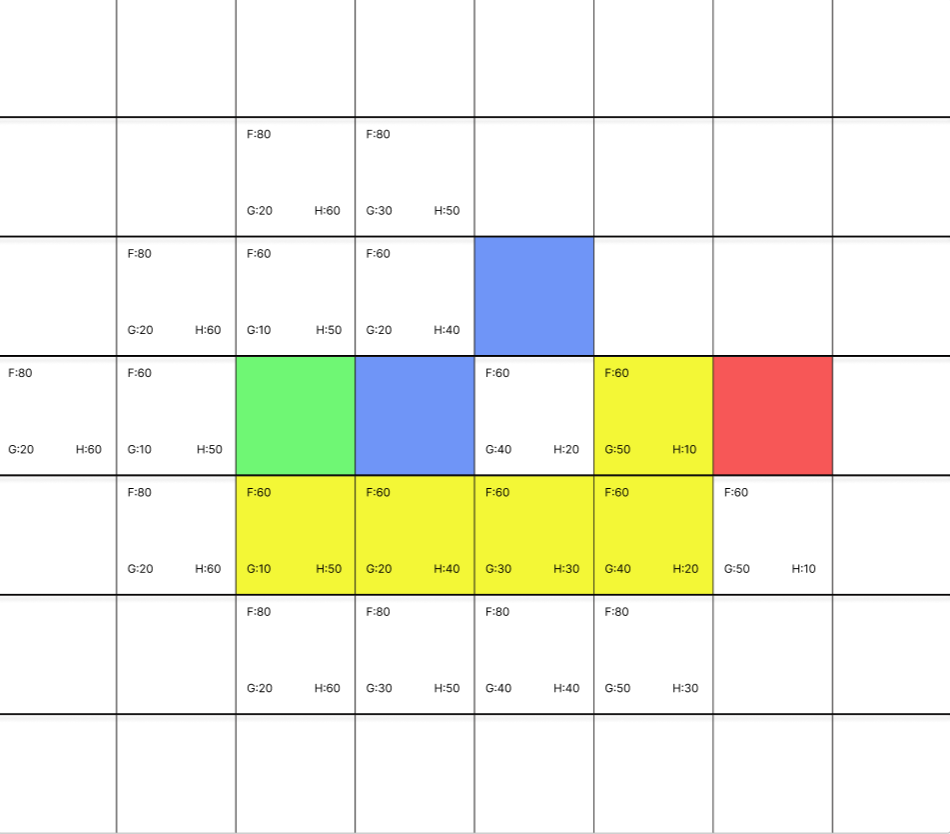 예를 들어 현재 f=60, g=10, h=12라고 가정하자. 현재 위치에서 4방향(상하좌우)로 확장 한다고 할때 확장 할 위치에서 우리는 목적지 까지 h를 유클리디안 거리 방식으로 다시 계산한다.