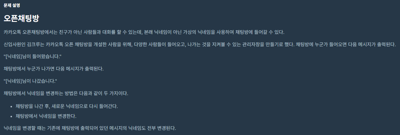 - 상태를 그냥 배열에 pair<유저 아이디,닉네임> 이렇게 저장할경우 Change 타입시 모든 배열을 순회 하면서 유저 아이디를 찾아야하기 때문에 O(n)의 시간 복잡도가 된다.