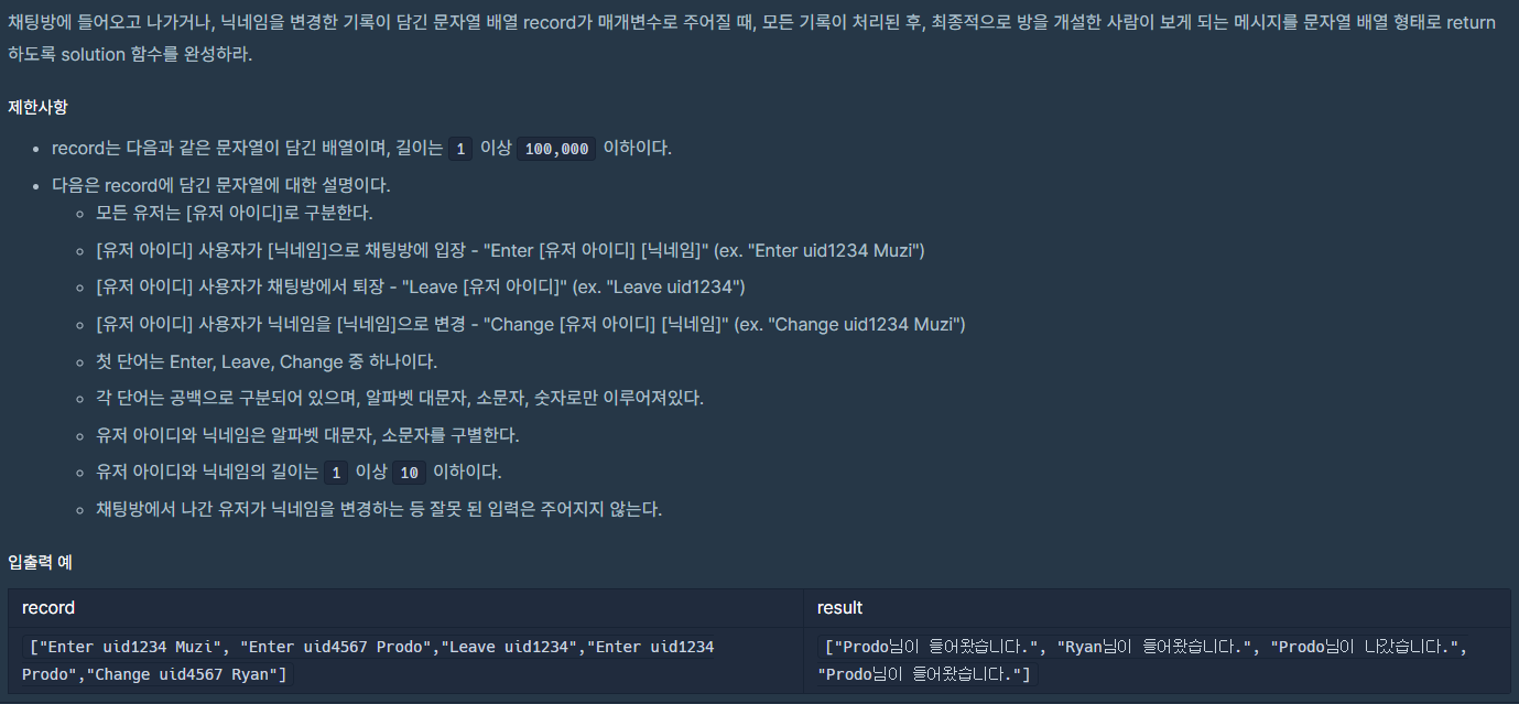 이 문제는 record가 주어지고 각각을 공백으로 구분했을때 첫번째는 타입, 두번째는 유저 아이디, 세번째는 닉네임이 주어진다. 각각의 타입에 맞게 결과를 기록 및 유저 아이디를 변경 해야한다.